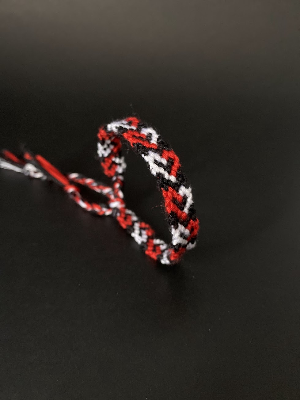 Separate 8 threads into 3 groups. Braid till reaching ~15cm in length, then tie a loop to close it, afterwards tighten it up by pulling each thread, and trim the extra.