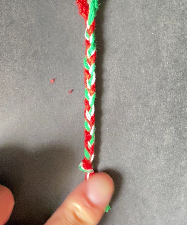 Separate into 3 groups. Braid till reaching ~15cm in length, then tie a loop to close it, afterwards tighten it up by pulling each thread, and trim the extra.
