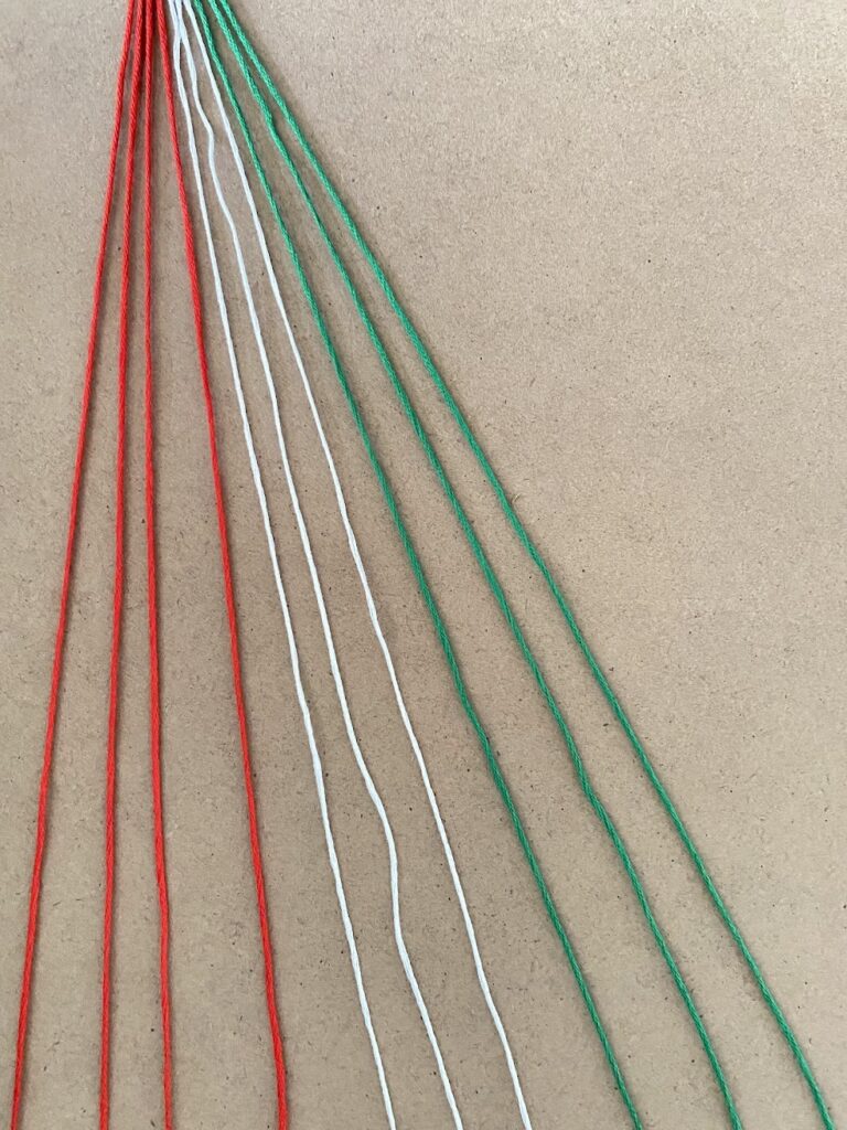 - Cut 10 cords, 120 cm (47 inch) each. Line them up in the following order.