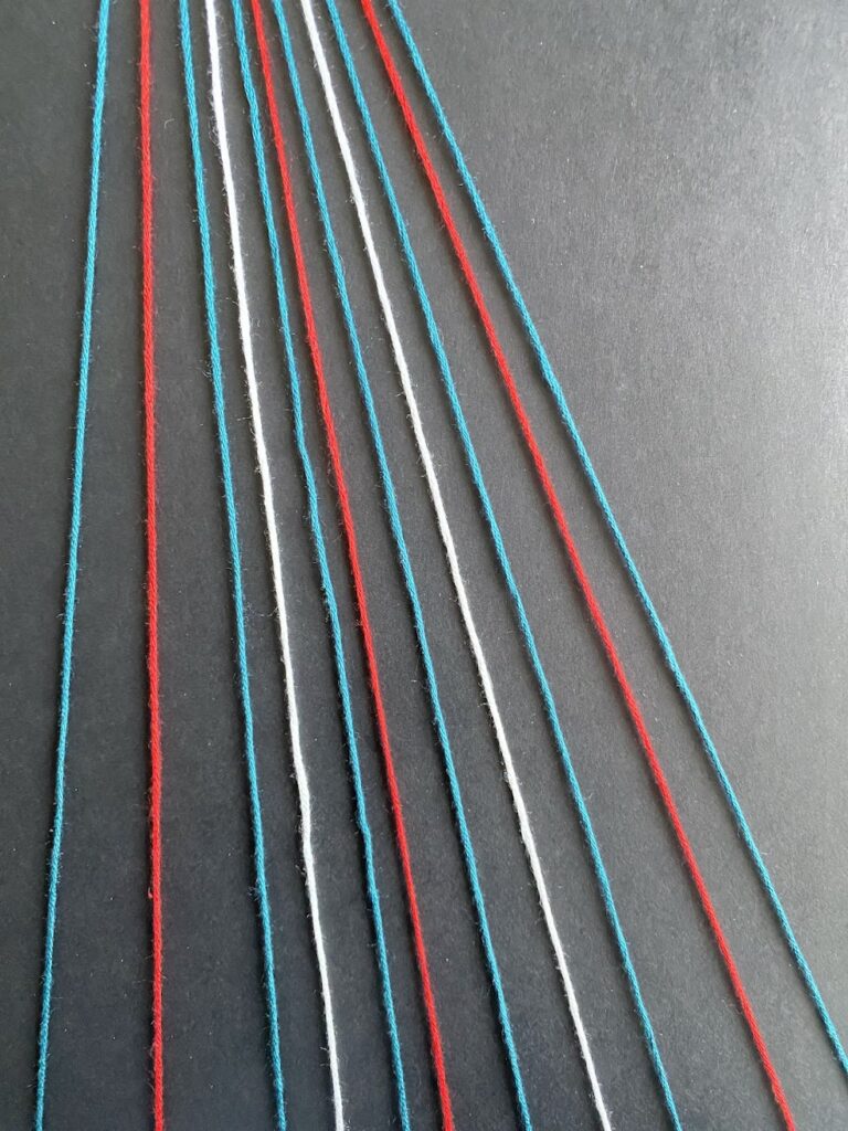- Cut 11 cords, 120 cm (47 inch) each. Line them up in the following order.