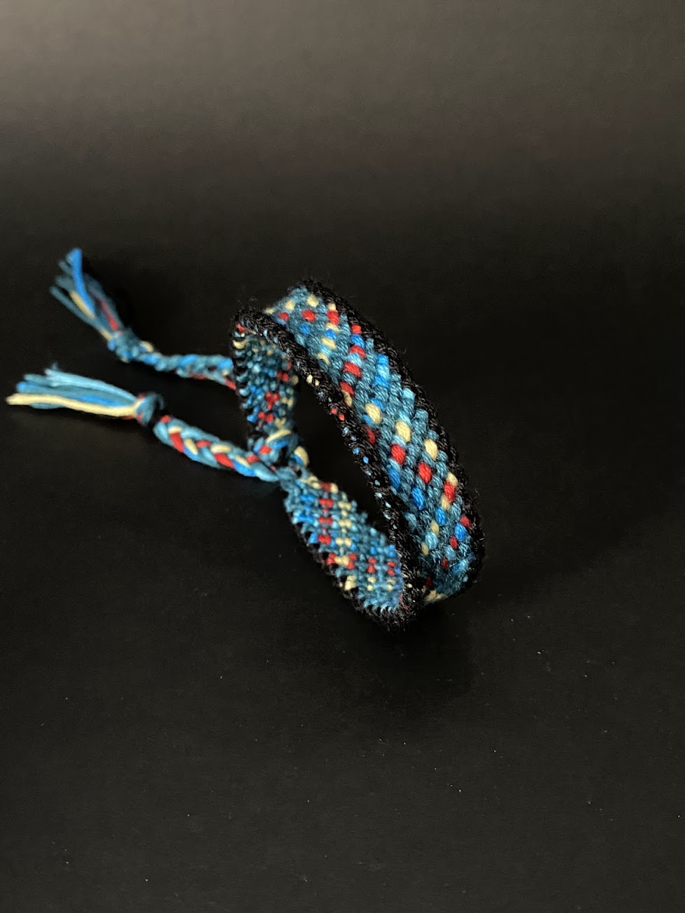 Separate 12 threads into 3 groups. Braid till reaching ~15cm in length, then tie a loop to close it, afterwards tighten it up by pulling each thread, and trim the extra.