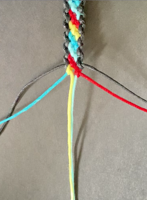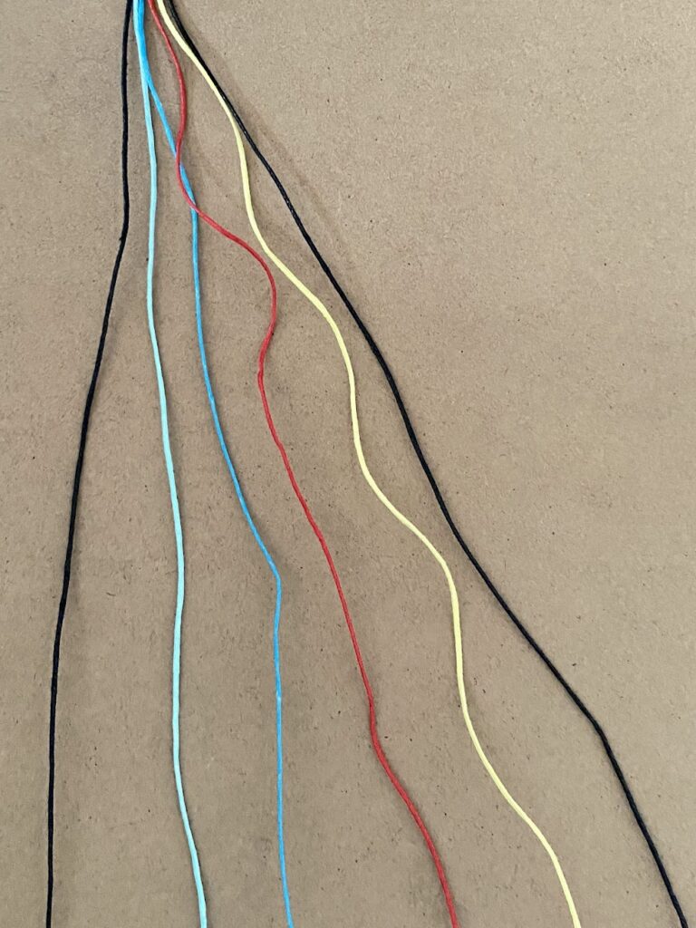 - Cut 6 cords, 120 cm (47 inch) each. Line them up in the following order.