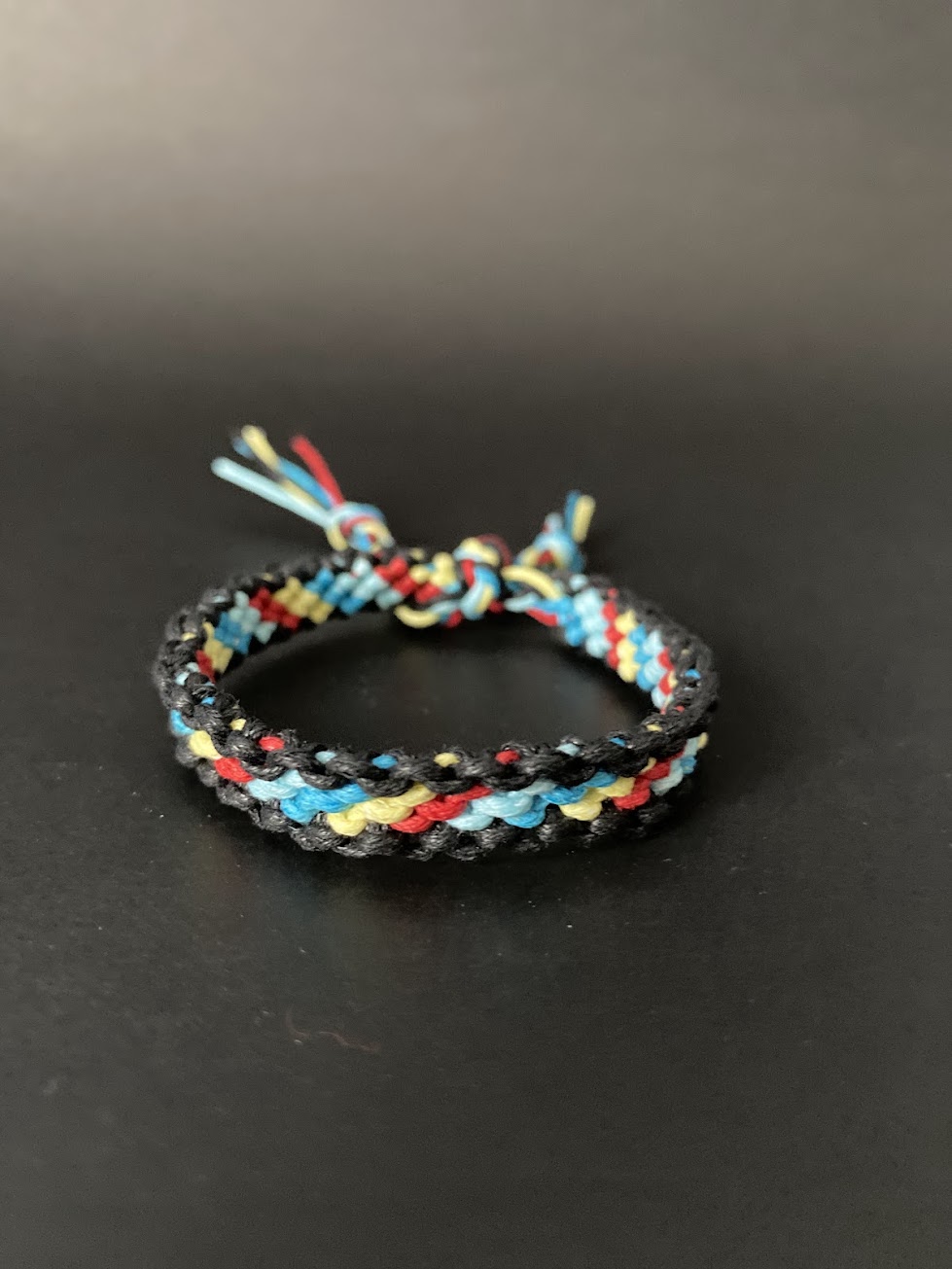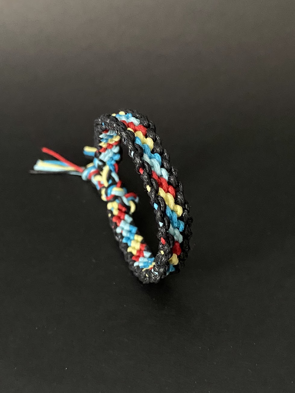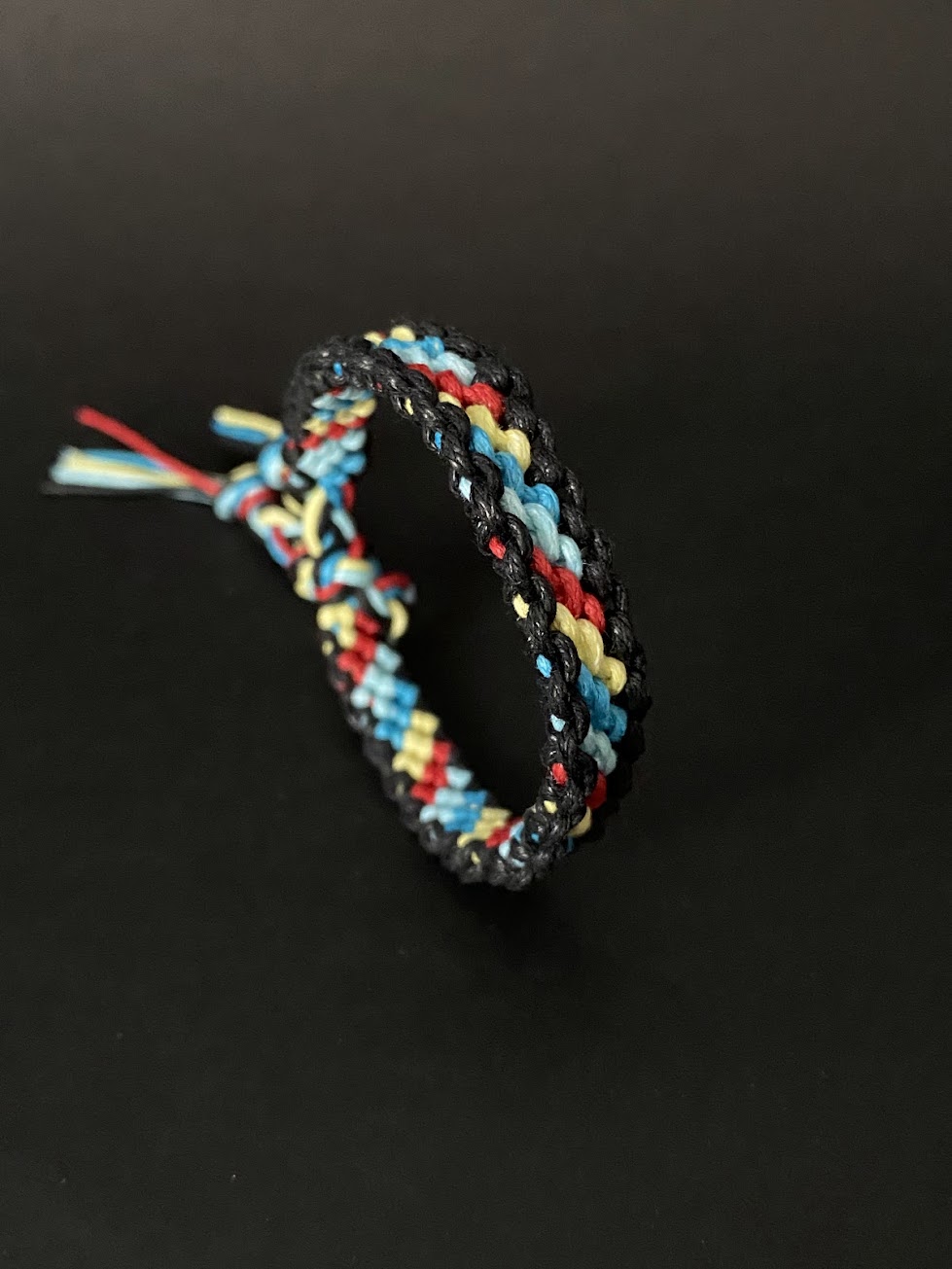 Separate 6 threads into 3 groups. Braid till reaching ~15cm in length, then tie a loop to close it, afterwards tighten it up by pulling each thread, and trim the extra.